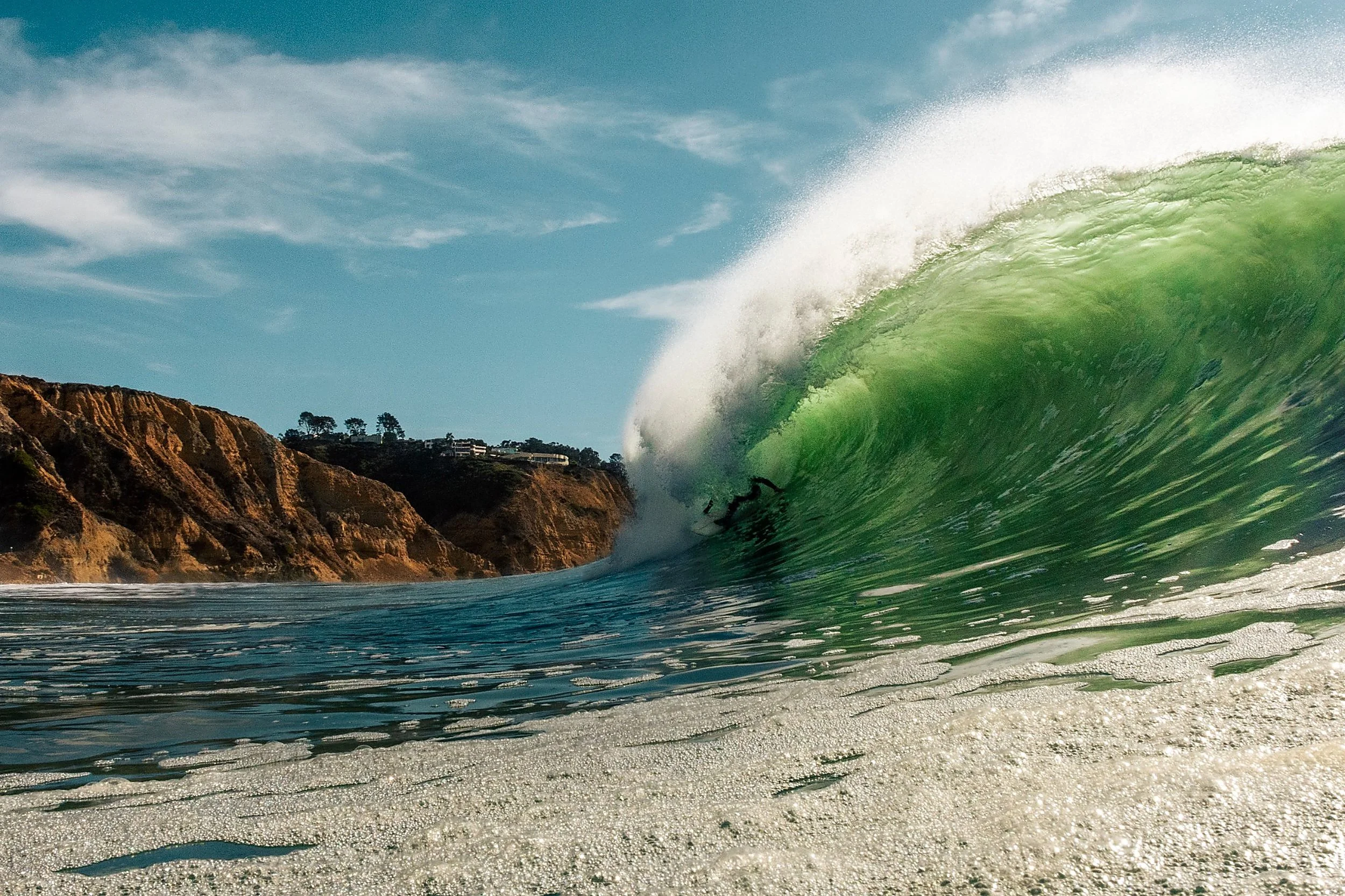 Shots from shore, in the water, and from the sky with drone